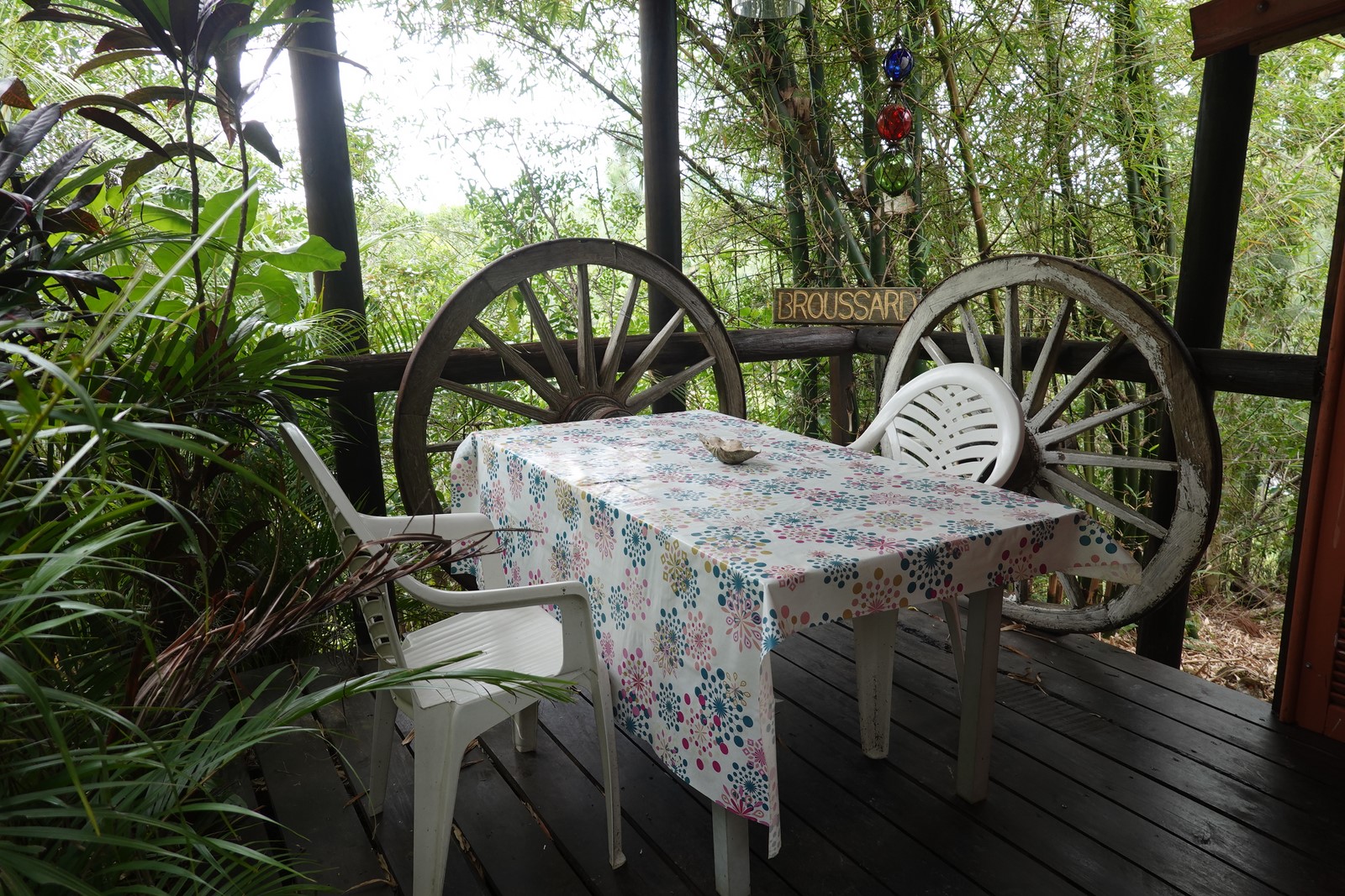 Le Chalet Broussard est une immersion dans l'ambiance "caldoche" des stations d'élevage de Brousse. Vous serez dans un environnement Broussard dans les moindres détails. La terrasse tres spacieuse permet une immersion dans la nature. On s'attarde volontiers le matin sur la tersasse et non loin "le broussard" surveille les plantations endémiques favorables en forêt sèche. Il ne manquerait plus que les animaux mais on les imagine très bien brouter sur les prairies bien visibles d'en face ou les chevaux gravir les collines visibles sur 90° du chalet Broussard. A défaut, les poules du tour du monde passeront devant votre chalet se randonnant vers la forêt nourrissante . Les pinus et nos immenses bambous tres présents apportent l'ombre nécessaire pour apprécier le vent apportant une douceur continuel Le salon permet également d'être entièrement ouvert sur la nature. C'est au Chalet Broussard qu'on apprécie le mieux les levers du soleil