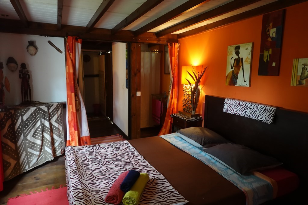 - deux chambres séparées à thème chacune : la première chambre est "Out of africa" -parentale lit couple- - et la deuxième chambre est "Mélanésie" - 1 lit simple-mezzanine et un autre lit simple. Un bureau d'angle est installé dans la chambre - le plafond est haut -