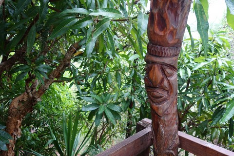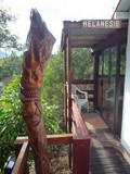 Le chalet "Mélanésie - Out of africa" - est une immersion dans la nature avec vue panoramique sur Montagne et vallée. Vous y trouverez le calme absolu ; il est situé en pleine nature . Les oiseaux de multiples couleurs adorent cet endroit. Les jeunes manguiers rappellent l'environnement franchement tropical. Le point de vue de la cuisine à très large vitre et bien illuminée donne sur la montagne et la vallée;Le soir une lumière extérieure rend l'ambiance encore plus insolite. La décoration est combinée par nos voyages en Afrique et par l'environnement mélanésien du pacifique sud