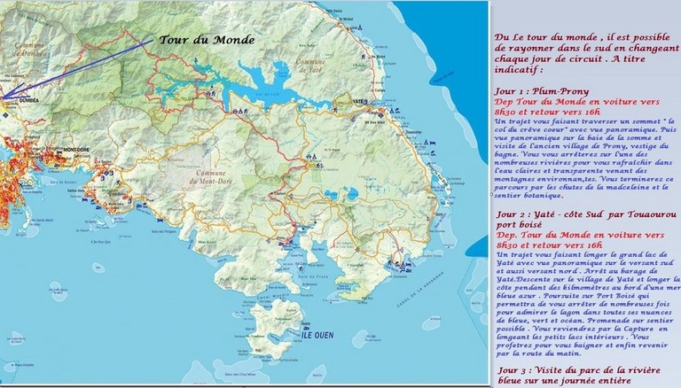 Parc de la Rivière bleue: Réserve naturelle de 9045 hectares; rassemble un grand nombre d'espèces végétales et animales endémiques au territoire. Par aménagé pour de longues randonnées, pique-nique Les chutes de la madeleine: Situées au coeur au coeur de la plaine des lacs - non loin de la rivière bleue- Sa flore endémique est unique au monde ; sentier botanique.Prony: ancien pénitencier puis des vestiges d'exploitation des mines de fer ; aujourd'hui un petit village piétonnier au bord de la baie. Les pans de murs de pierres taillées au carré par les bagnards sont envahis par les racines de banians géants. Un sentier de randonnée de 3 à 4 h vous plonge dans un environnement magnifique. Le barrage de Yaté et en poursuivant : les bords de mer de Touaourou à Port Boisé habités par les tribus dans un cadre verdoyant et exotique